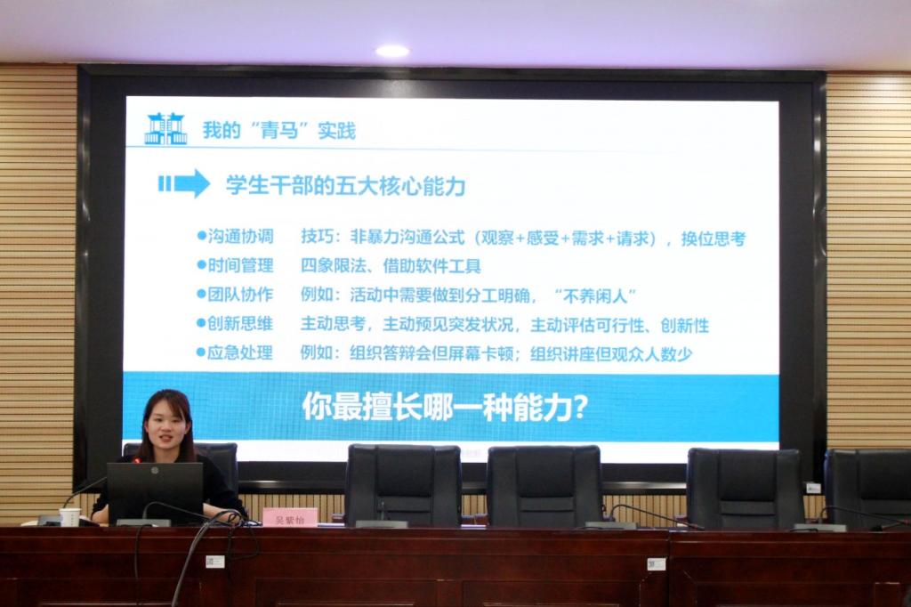 吴紫怡以“脚踏实地,做有能力的实干家”为题展开分享。她结合自身参加青马工程的学习经历,指出青马工程旨在为党培养信仰坚定的青年政治骨干,并从筑牢信仰根基、提升实践能力、培养战略思维三个维度阐释理论学习的核心要求。她结合学生工作实务,讲解了公文格式、沟通技巧、办公工具使用等实用内容,鼓励学员在实践中实现学习与工作的双向促进。最后,她勉励学员:学生工作无小事,平凡积淀成长,把挫折当作财富,以实干担当走好青春奋进之路。