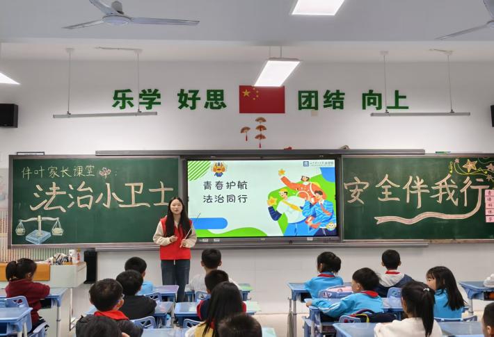 4月21日,法学院“蒲公英”普法团走进岳麓区第一小学枫林小学,开展“青春护航·法稚同行”主题普法宣讲活动。本次活动聚焦反校园欺凌与交通安全两大主题,通过情景体验、互动问答、律动操等趣味形式,为孩子们带来一堂生动实用的法治与安全教育课。
