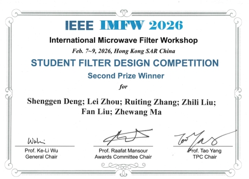 近日,国际微波滤波器研讨会(IEEE International Microwave Filter Workshop 2026,下文简称IEEE IMFW 2026)在中国香港落幕。本次研讨会设有主旨报告、特邀讲座、产业论坛及国际滤波器设计大赛等多个环节。物电学院研究生团队在指导老师刘凡的带领下,与来自全球高校和科研机构的20余支高水平队伍同台竞技,在国际滤波器设计大赛中夺得亚军。