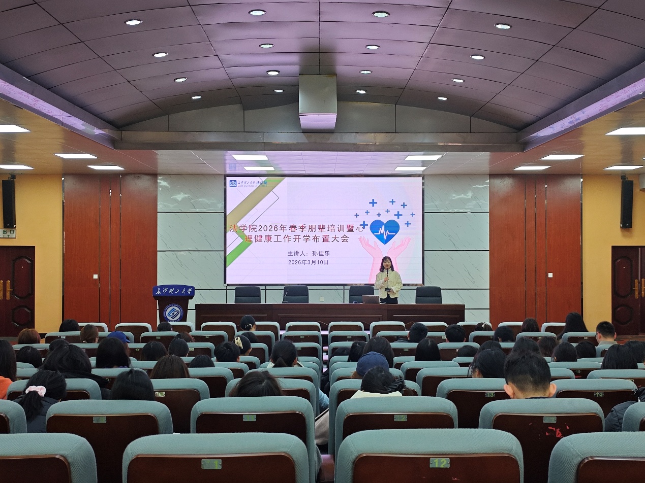 为夯实新学期心理健康教育基础,提升朋辈互助与心理危机干预能力,3月10日下午,法学院于金盆岭校区四教报告厅召开本学期首次朋辈互助员培训会暨心理健康工作布置会议。会议由心理辅导员孙佳乐主讲。培训中,孙佳乐围绕心理危机识别、心境障碍辨析展开讲解。她结合真实案例明确普通心理问题与危机预警的边界,指出当出现... 【2026-03-11】
