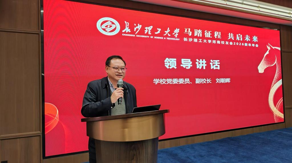 马踏征程,共启未来。1月24日,我校河南校友会2026年新年年会暨智能化低碳建养技术论坛在许昌迎宾馆举行。校党委委员、副校长刘朝晖,河南省公路学会首席专家张全林,理事长朱理平,原河南省交通运输厅一级巡视员李强,学会副理事长王春江出席,学校校友中心、交通学院等单位负责人及在豫校友、校促会会员共160余人参加活动。