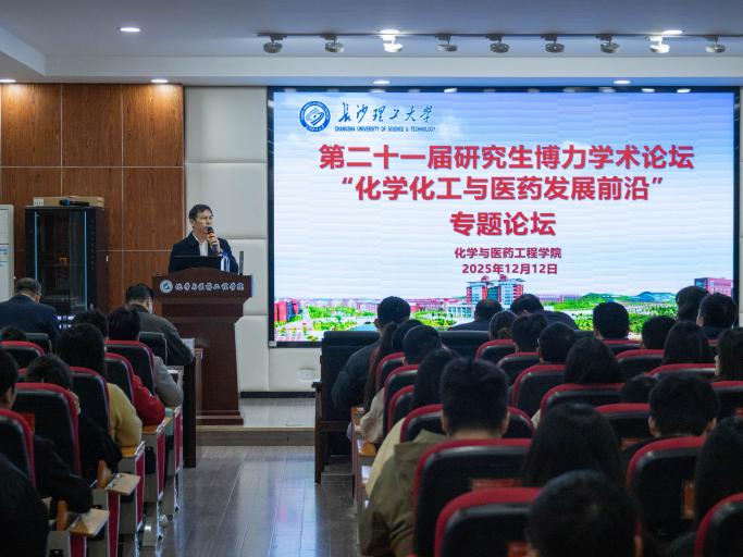 2025年12月12日上午8:30,由长沙理工大学研究生院主办,化学与医药工程学院承办的第二十一届研究生博力学术论坛“化学化工与医药发展前沿”专题论坛,在云塘校区工科三号楼B319报告厅隆重开幕。本次论坛特邀湖南师范大学化学化工学院院长杨荣华教授,中南大学化学化工学院原院长刘又年教授,湖南大学高红霞教授做大会主旨报告,化学与医药工程学院党委书记宋刘斌、院长张跃飞、党委副书记、副院长李家春等领导出席开幕式,论坛开幕式由学院副院长陈启杰主持,学院师生共计200余人参加了此次研究生学术论坛。