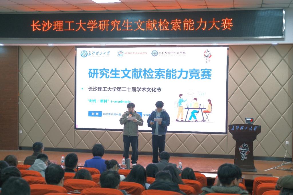 为提升研究生信息素养与科研创新能力,促进跨学科学术交流,12月18日晚,长沙理工大学第二十届研究生学术文化节文献检索能力竞赛决赛在云塘校区文科楼A200成功举办。本次竞赛由材料科学与工程学院和水利与海洋工程学院承办,覆盖全校所有学院,共吸引234支队伍、超过700名研究生参与,经过初赛、复赛的层层选拔,最终晋级14支队伍在决赛现场展开激烈角逐。