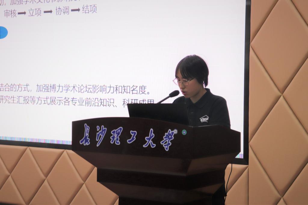 校研究生团工委副书记丁欣作为主席团代表对校研会的部⻔构成做了简短介绍,提出规范性和服务性、团结性、创新性四点的工作期望,指出“学⽣⼯作的本质是群众⼯作”,对2022-2023学年⼯作计划进⾏了简要汇报。并希望各部⻔间能团结协作,共建互助友爱的⼤家庭。