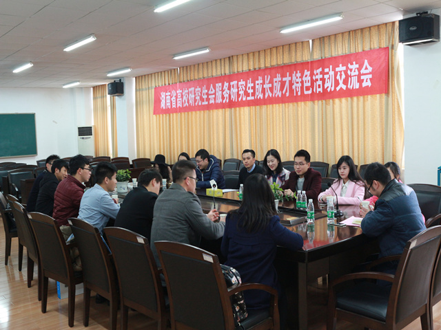 中南大学研会主席王萌在交流中提到,研会工作要围绕“学术、就业、文娱”三大块进行,通过开展学术报告交流、模拟就业及指导创新创业、举办三分钟交友等活动,充分为研究生提供学术交流和个性展示的机会。湖南省委党校研会主席范世明分析了自身研会发展的局限性,积极主动与其他高校分享研会经验。此外,中南林业科技大学研会主席邹紫今介绍了本校的研会特色活动,分别是学术文化节、创新论坛、创新创业沙龙及花样年华创意大赛,让研究生们在丰富多彩的文化沙龙中受益良多。