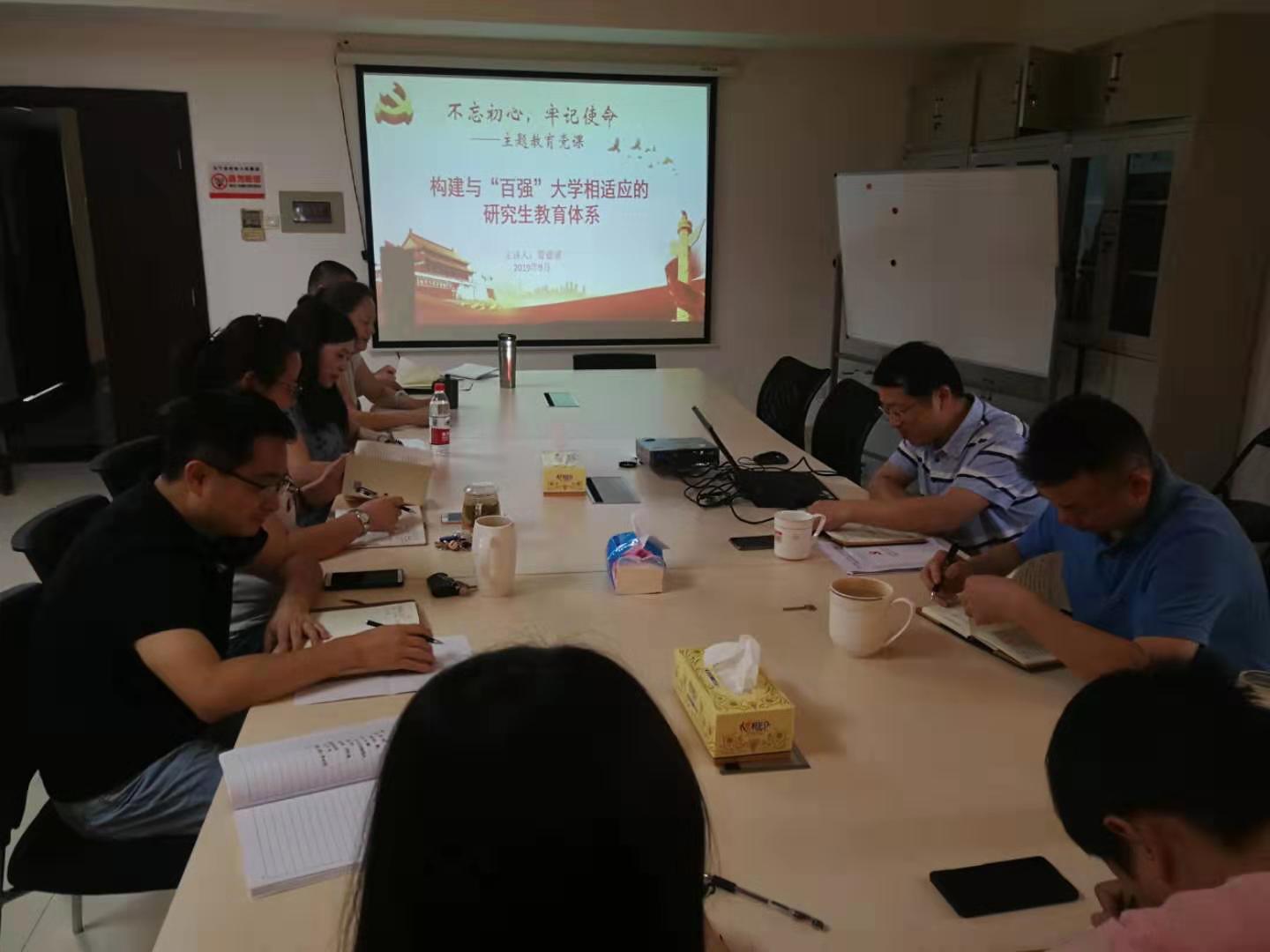 管德清阐述了开展“不忘初心、牢记使命”主题教育的意义。他指出,开展主题教育,用习近平的思想武装头脑是学校党委建设“百强”大学建设目标的坚强保障。学习共产党的发展历史,熟知共产党在各个发展阶段特别是新时代取得的伟大成绩,深入理解共产党始终为了一个目标前进,是“不忘初心、牢记使命”的具体体现。他介绍了研究生院支部主题学习的实施方案并对具体工作进行了部署,并就扎实推进主题学习进行了动员。他要求支部一定要对照上级、群众的要求进行深刻剖析,理解主题教育的总体要求和主要目标。通过主题教育,发挥支部和党员的先进作用,构架与“百强”大学目标相适应的研究生教育体系。领导要带头学习,做有担当的好干部、好党员,要树立宗旨意识,做到全心全意为师生服务。从招生、培养、学位、思政各方面,深入思考如何提供优质服务,帮助研究生在学习期间能做出应有的成绩。最后,他强调,要认真思考我校研究生教育现状与学校“百强”大学目标的差距,清醒地认识制约发展的瓶颈,充满激情,努力拼搏,力争在博士学位点申报建设等工作方面有所突破,早日实现我校“百强”大学的目标。