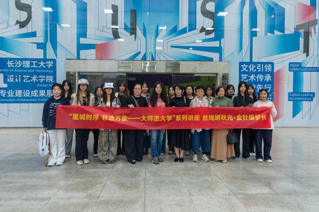 2025年9月23日下午,长沙理工大学设计艺术学院联合长沙市非物质文化遗产保护中心共同举办“星城时序 非遗万象”大师进大学系列活动,活动以“丝线绣秋光 金针铸梦长”为主题,特邀当代湘绣艺术家刘雅老师,与师生分享湘绣艺术的传承与创新之路。