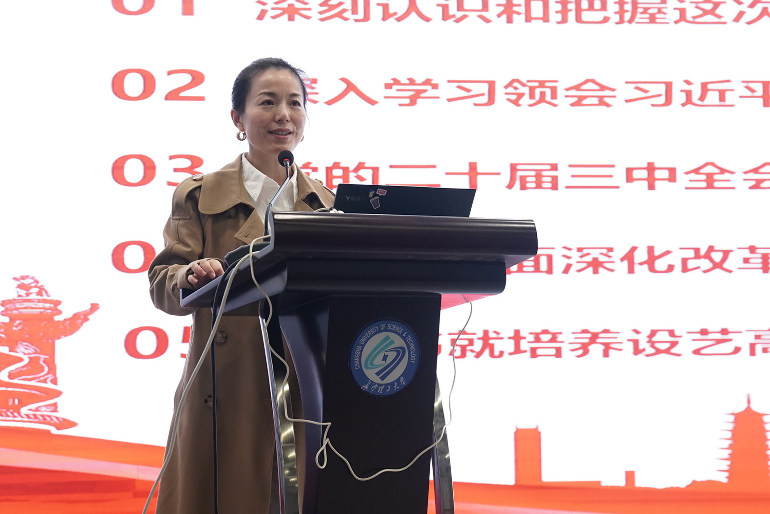 首先,郭剑从党的二十届三中全会的重要意义、习近平总书记在全会上的重要讲话精神、进一步全面深化改革是建设高等教育强省的必由之路等方面进行了深入解读。她强调,全会精神不仅是全面深化改革的实践续篇,也是新征程推进中国式现代化的时代新篇;其次,特别提到了《决定》中关于教育、科技、人才的新要求,并提出了构建支持全面创新体制机制的重要性;最后,她结合学院人才培养理念、学科发展目标和优秀校友典型事例,激励新生将个人的艺术追求与国家的发展战略相结合,用艺术的形式展现中国式现代化的伟大实践和成就,为文化强国建设贡献力量。