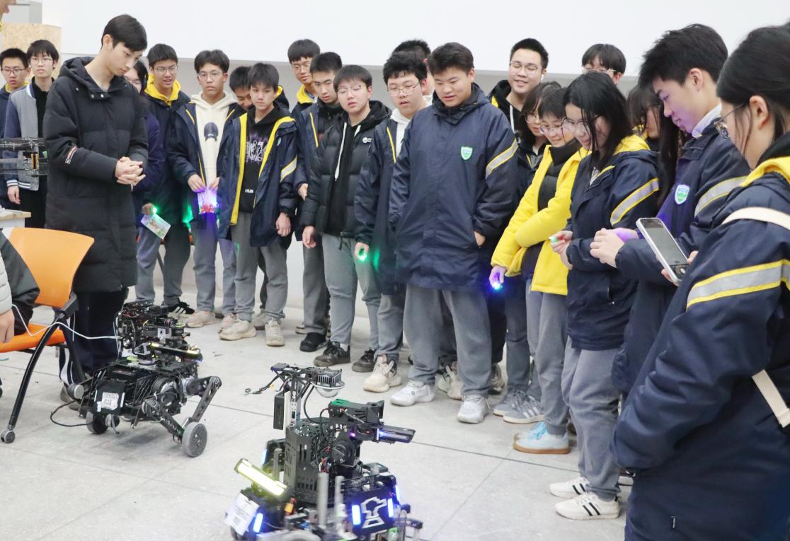 走进卓越工程师学院,同学们开启了一场关于“未来工程师”的探索之旅。从RoboMaster机甲大师赛的全尺寸实战场地,到创新创业教育展厅的成果陈列;从无人机实训室的精密设备,到大学生创新创业园的孵化项目——每一站都是一扇通往新世界的大门。为了让体验更加深入,学院特别安排了实操演示环节。在专业团队的指导下,同学们亲自上手操作步兵机器人、操控无人机飞行,在机械的律动与代码的跳动中,真切感受工程实践的乐趣与挑战。此次参观不仅让同学们对学校的学科竞赛体系和创新创业生态有了全方位认知,更引导他们在体验中思考:如何将奇思妙想落地为创新成果,如何在团队协作中锤炼学科素养。这不仅是研学的一站,更是生涯规划的一课。
